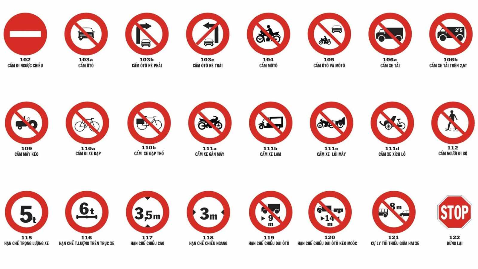 - Biển báo cấm: biển báo này chủ yếu có dạng hình tròn, viền đỏ, nền màu trắng, trên nền có hình vẽ hoặc chữ số, chữ viết màu đen thể hiện điều cấm. Một điều lưu ý là biển báo cấm có mã P thể hiện điều cấm và DP là hết cấm. Thông thường, biển báo cấm có đường kính 70cm, viền 10cm và vạch sơn đỏ khoảng 5cm.
